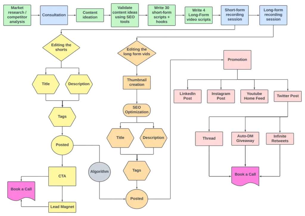 We come up with video ideas, script them, guide you through the entire recording process, and edit them. A couple of hours of recording per month creates a flywheel of video content that gets distributed across all major platforms.